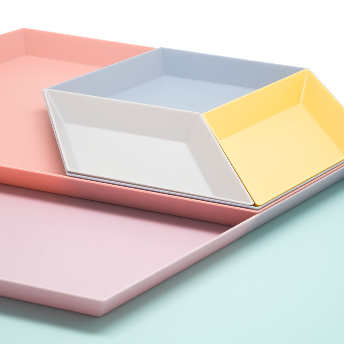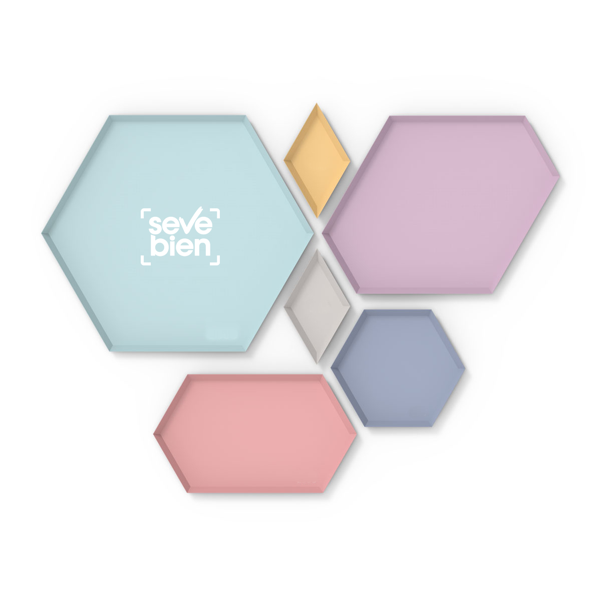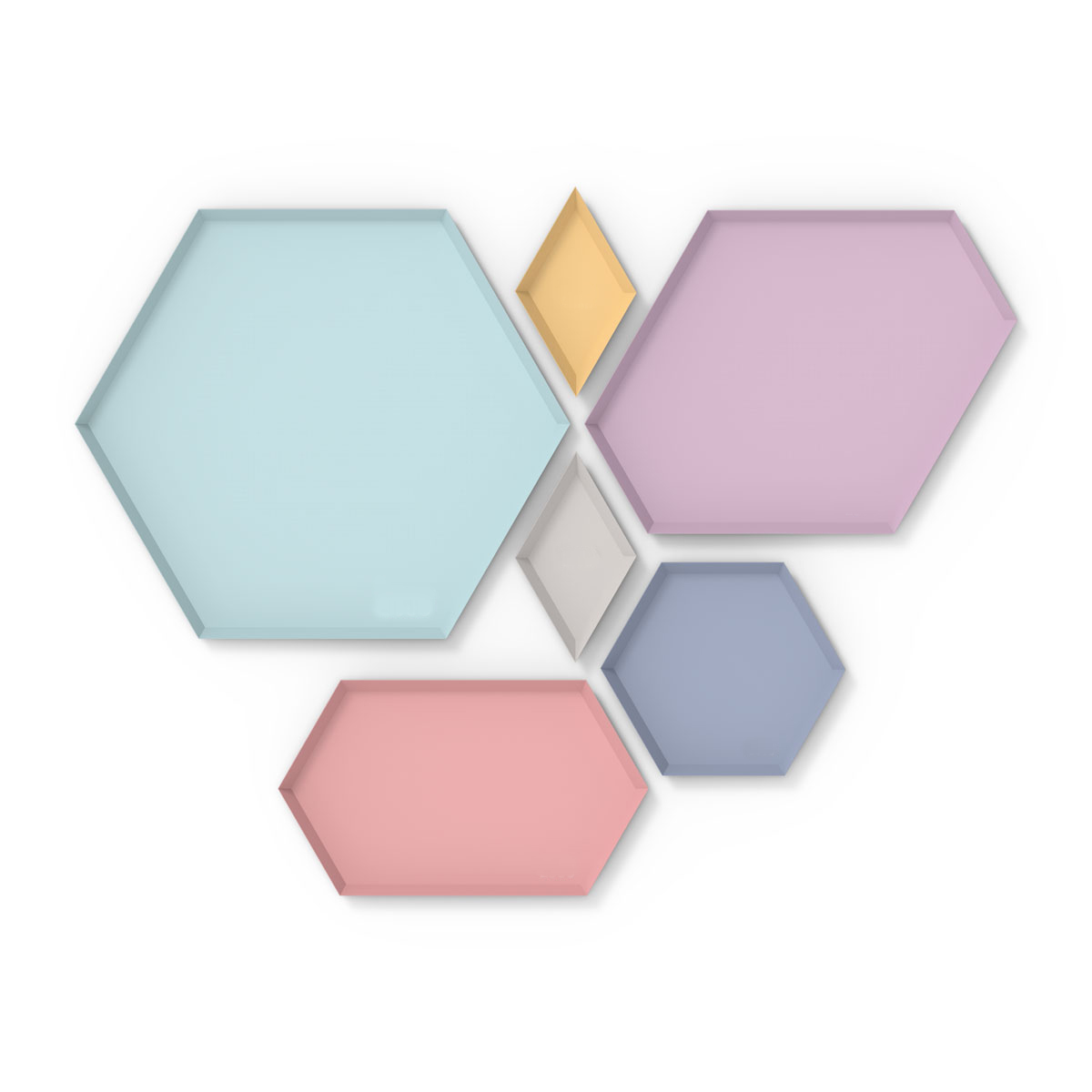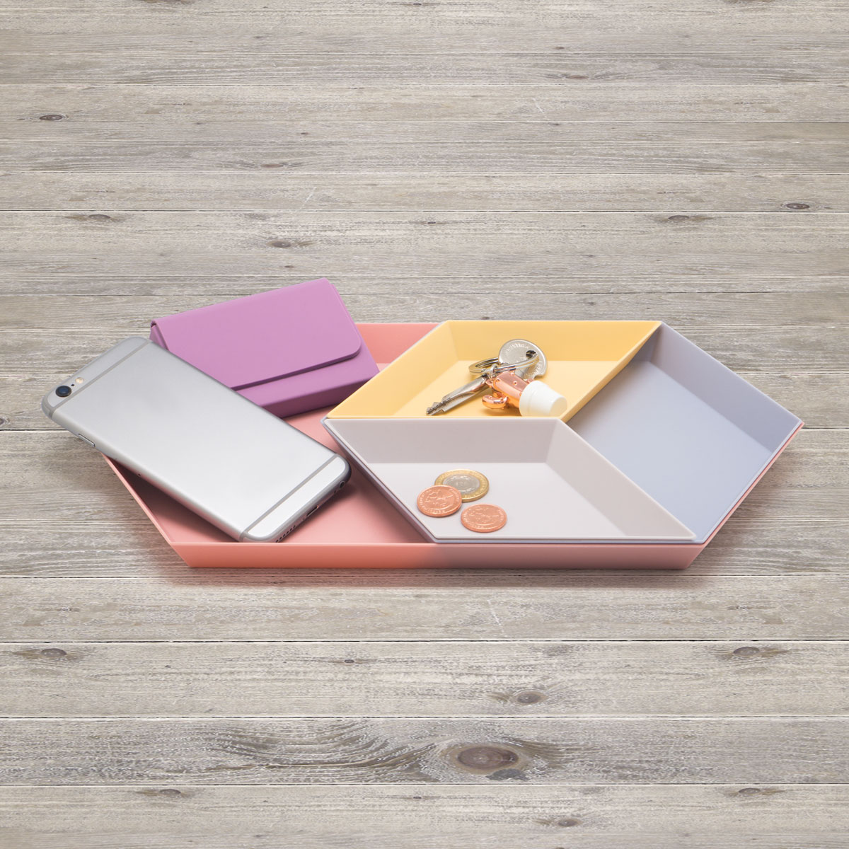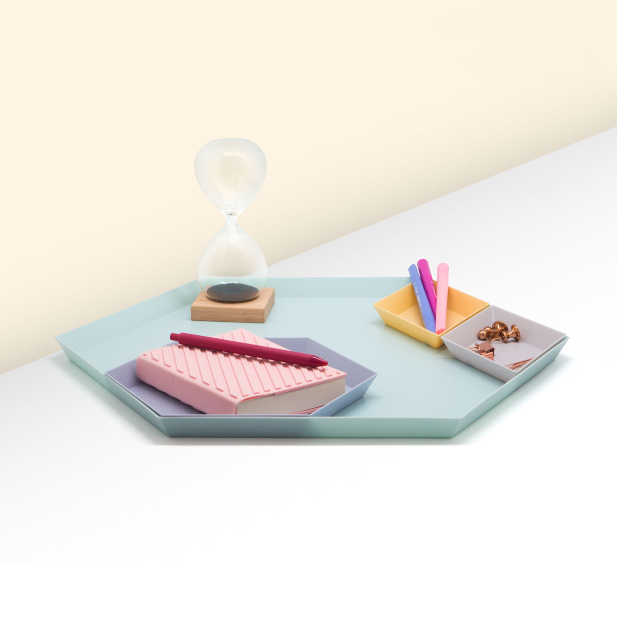 2 módulos de 19 x 11 cm, 1 módulo de 29 x 22 cm, 1 módulo de 33 x 19 cm, 1 módulo de 38 x 33 cm y 1 módulo de 44,5 x 38,5 cm. Plástico. Organizador de escritorio con 6 bandejas modulables de distintos tamaños y colores.